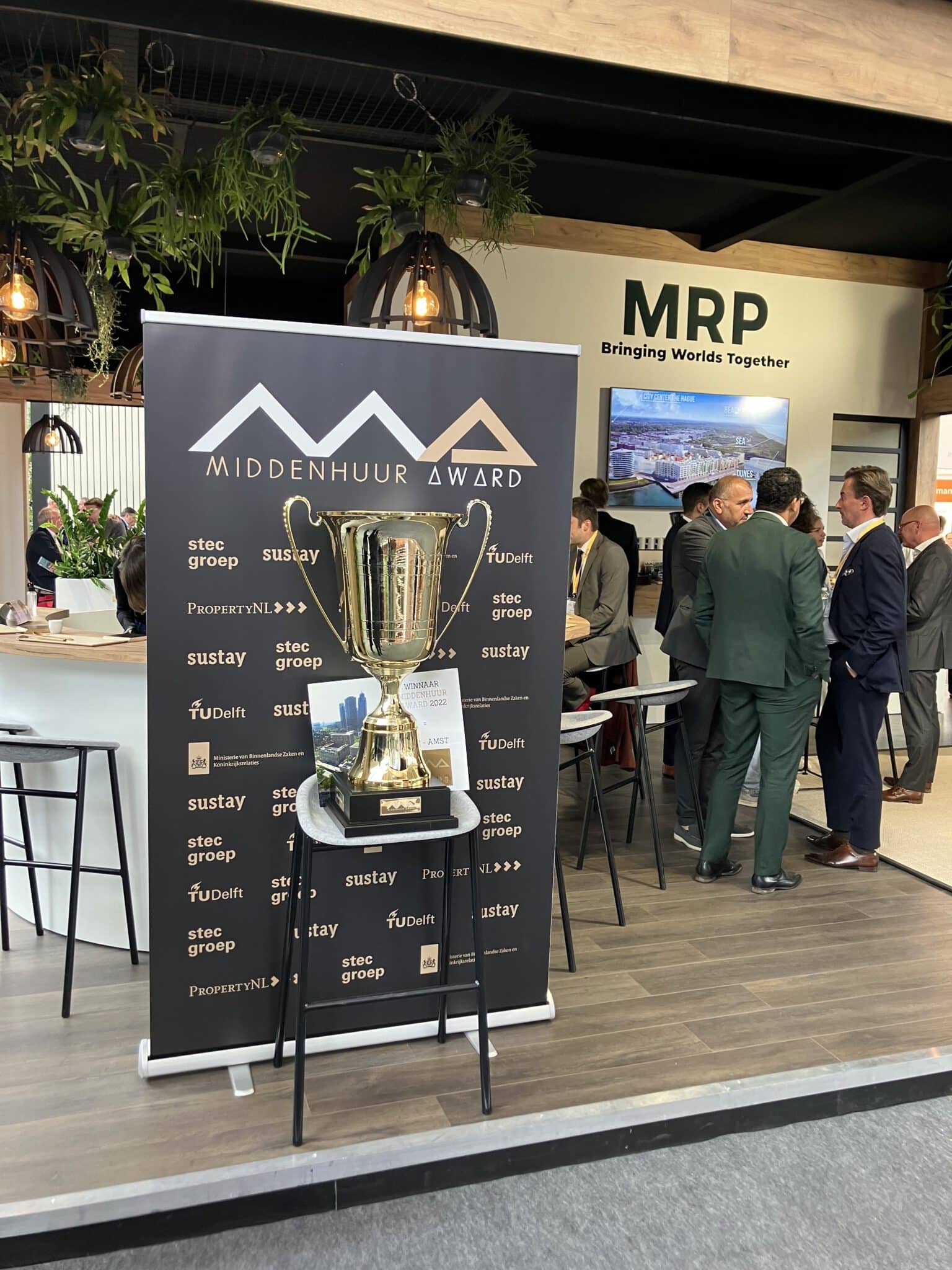 Winnaar en ceo / eigenaar van MRP, Bart Meijer kan zijn geluk niet op: “MRP helpt daadwerkelijk de middeninkomens met project AMST. Het voegt echt veel betaalbare woningen toe aan onze hoofdstad en dat is niet altijd makkelijk in Amsterdam. Het was een pittige businesscase, maar wie a zegt moet ook b realiseren. De beker gaan we een jaar showen in ons kantoor, maar eerst nemen we hem mee naar onze stand verderop op de PROVADA.”